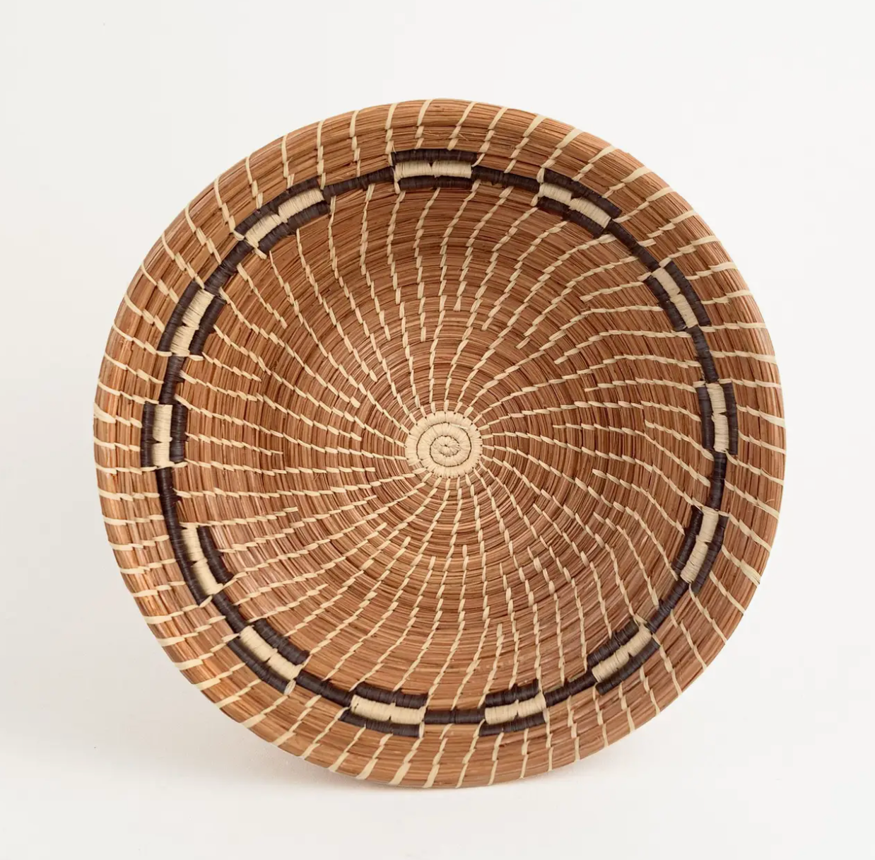 Perfect as a table centerpiece, bread or fruit bowl, or desktop organizer. Intricate raffia stitching on coils of sustainably harvested pine needles. Gently sloping sides feature a two-tone band of alternating light and dark raffia that accent the warm natural color of the pine needles.