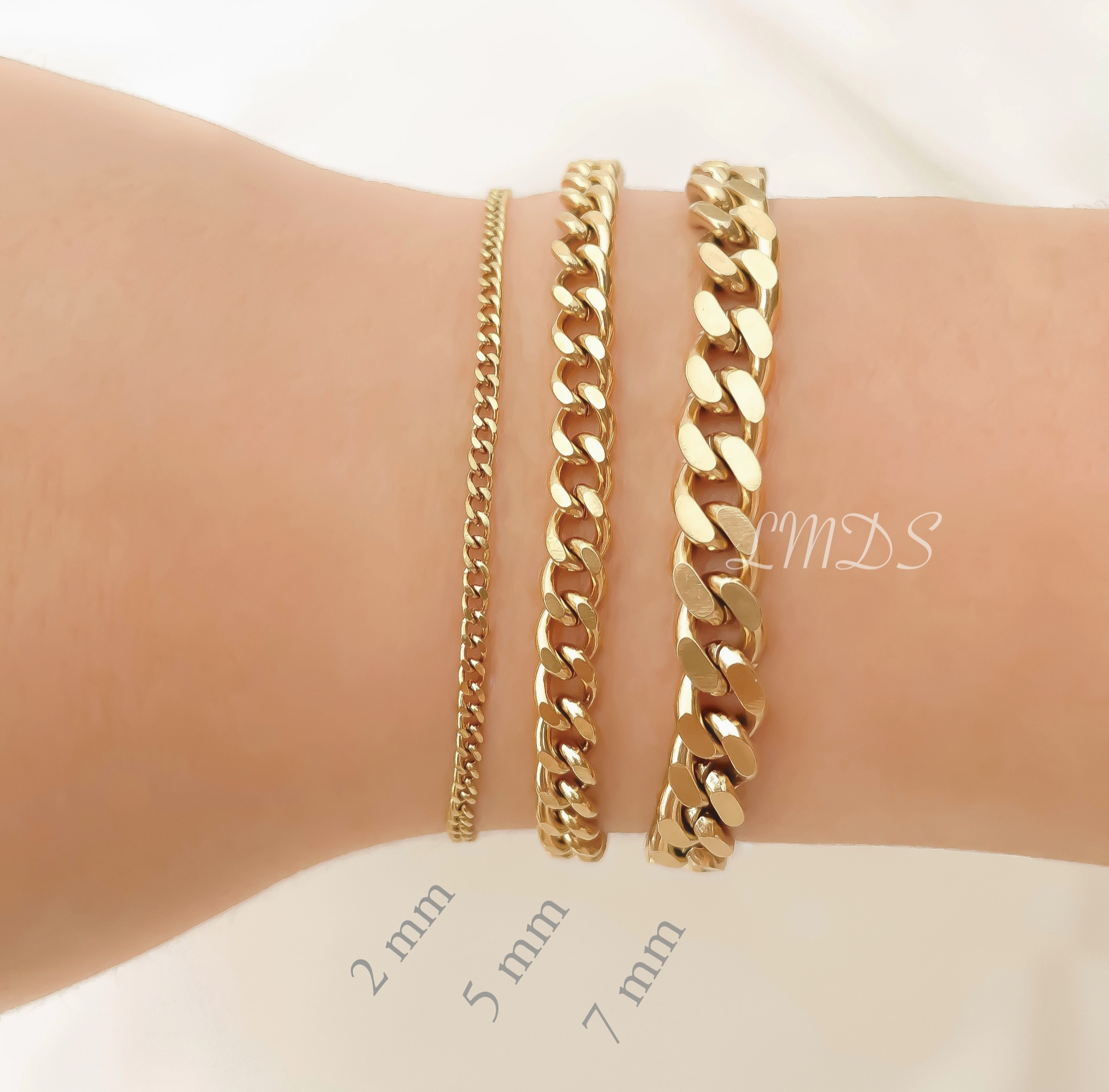 Perfect for layering with daintier pieces, this curbchain anklet is available in three different widths. 2 mm is for those who like daintier designs. If you don't like subtlety, make a statement with bold and chunky chain links of 5 and 7 mm. Made of high polished stainless steel, these curb chain anklets offer just the right amount of shine. Available in gold and silver. Material: Stainless Steel Chain Type: Curb Chain (2 MM, 5 MM, 7 MM) Colour: Gold and Silver Options Length: 8"(clasp and jump ring included) + 2" extender