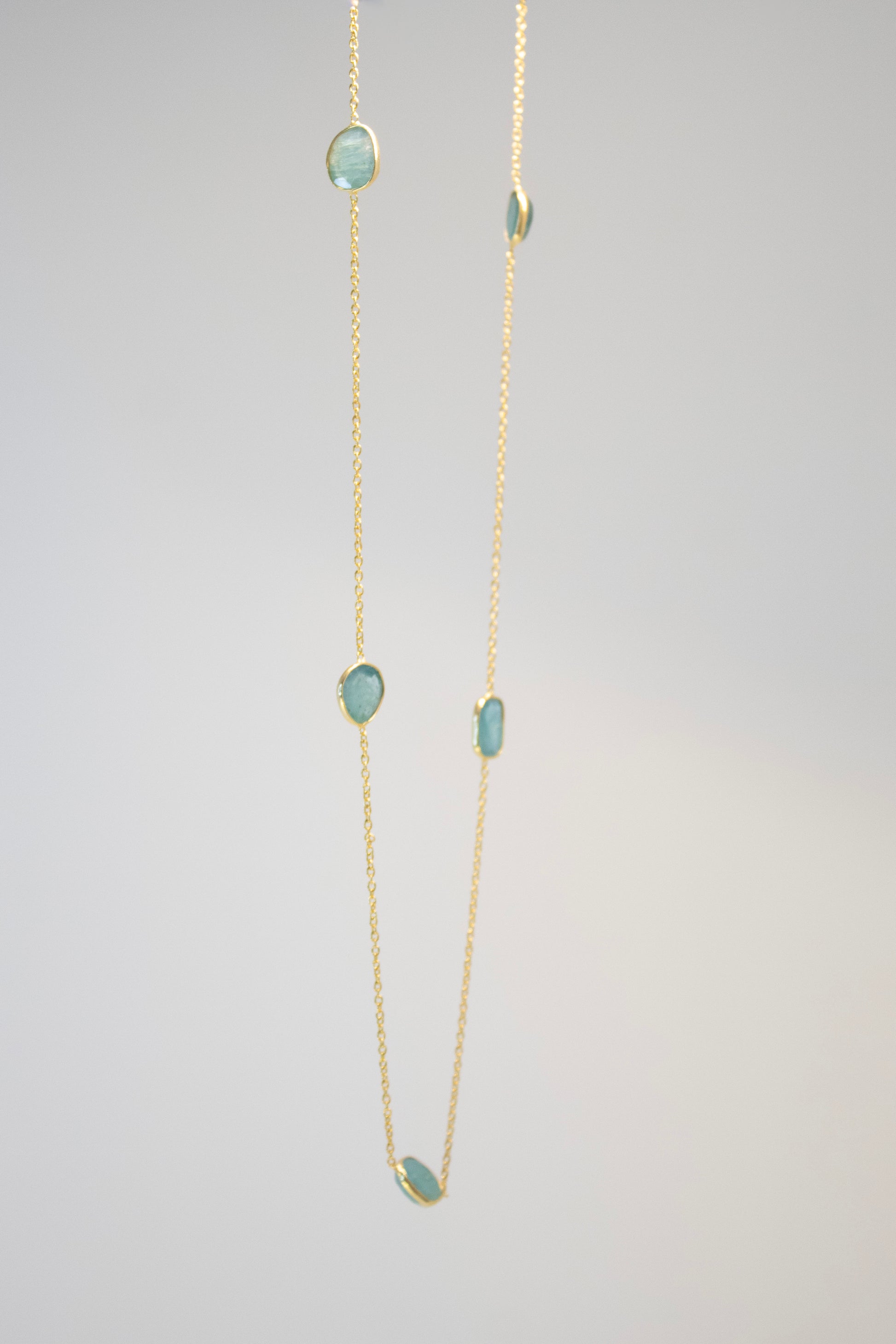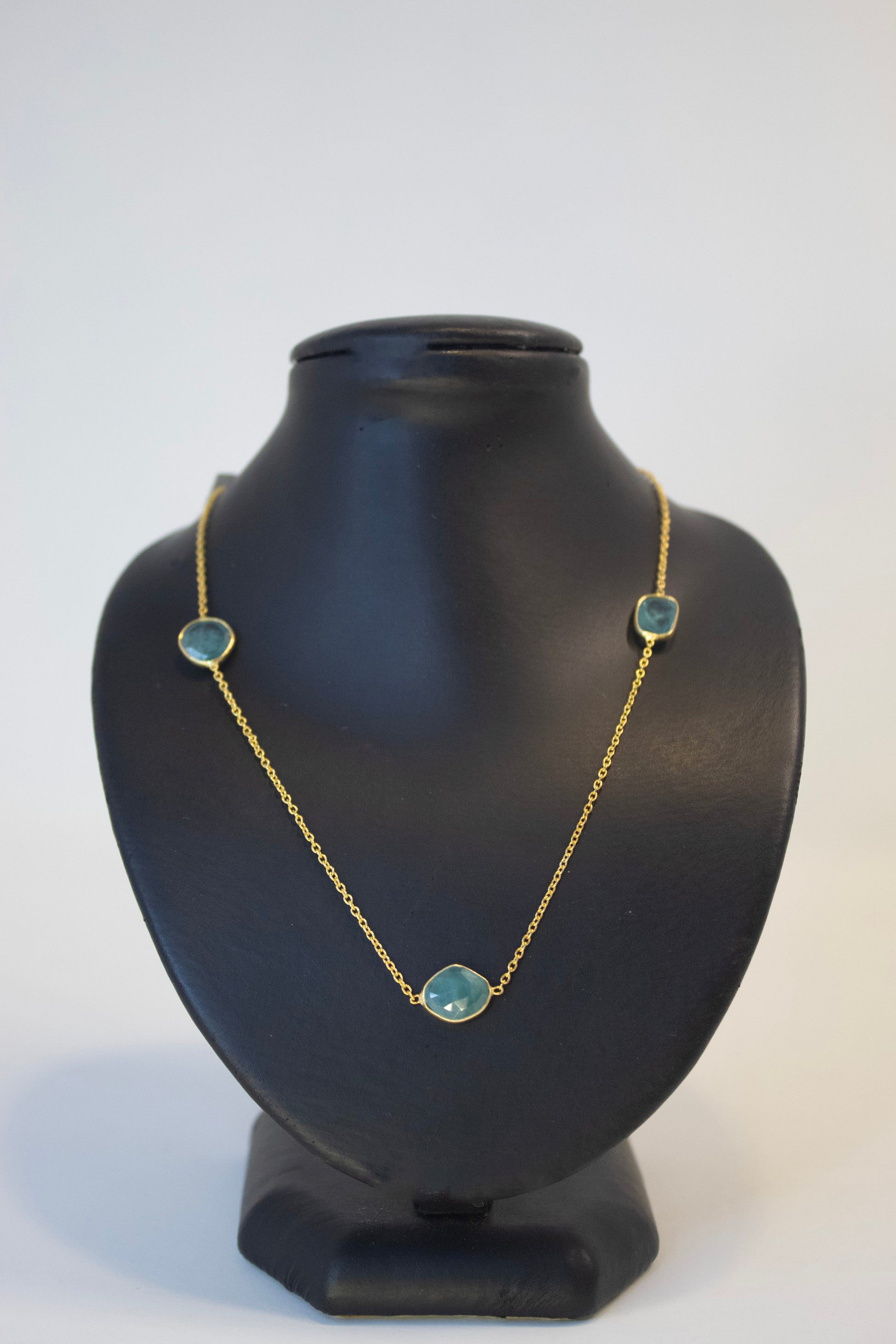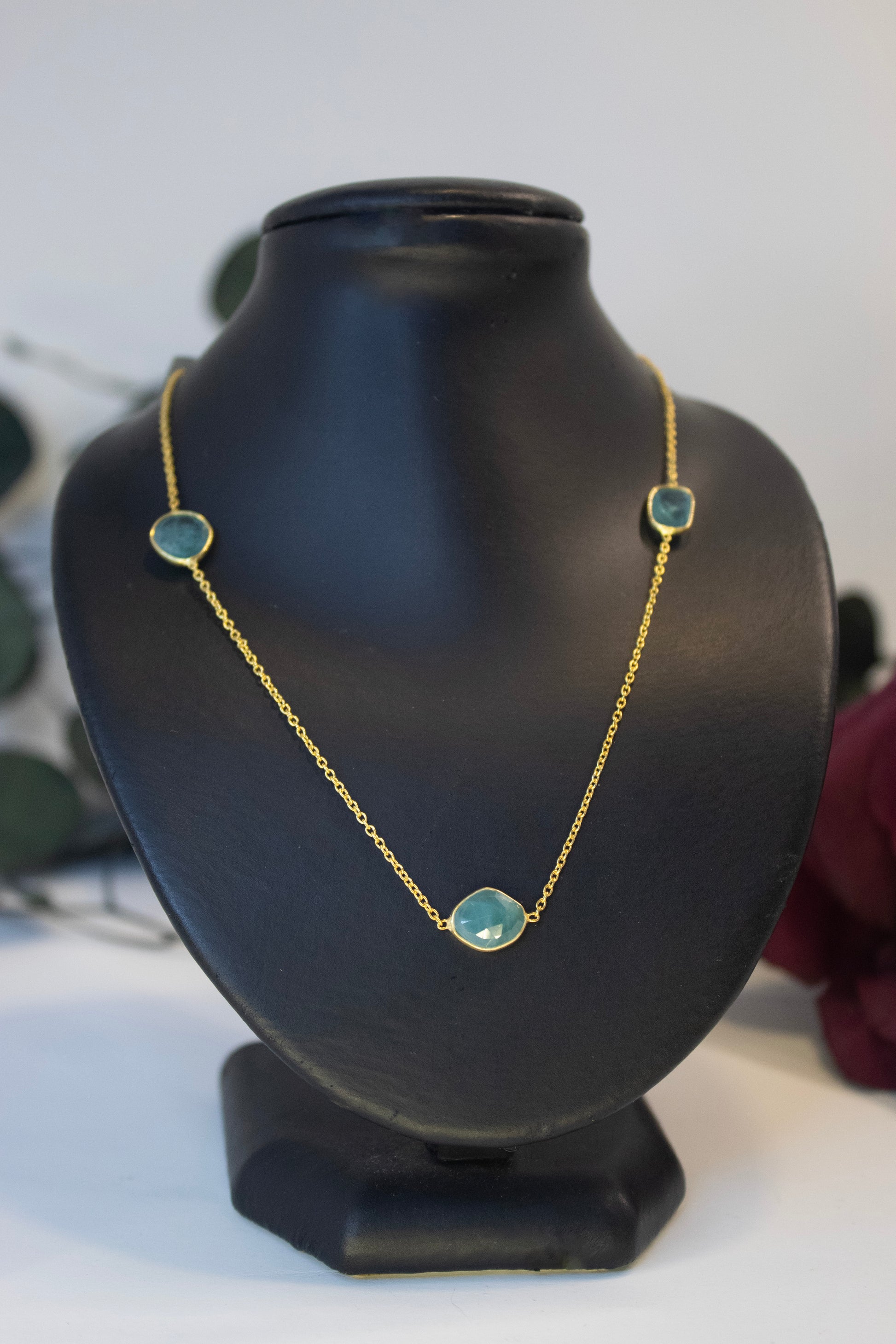 Introducing our Gold Cordierite Set—a symphony of elegance and charm combines dainty allure with timeless sophistication. The necklace, crafted with a delicate chain spanning 18.5 inches, features five teal-ish cordierite gems, each just shy of 3 inches apart. These gems, showcasing the enchanting hues of cordierite, lend a touch of sophistication to the wearer. The earrings, with pendants measuring about half an inch and just a little longer than one inch in total, boast two cordierite gems delicately connected by small loops. At Alternatives, we take pride in offering exquisite jewelry and ensuring ethical practices in our sourcing. Adorn yourself with the understated beauty of the Gold Cordierite Set—a testament to grace and responsible craftsmanship.