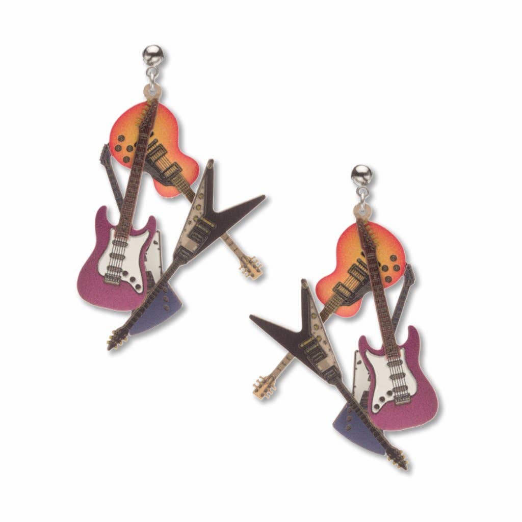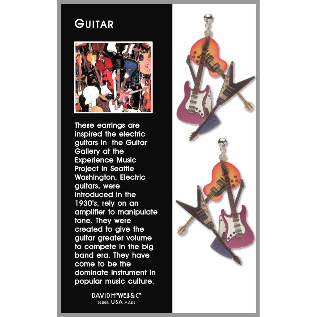 These earrings are inspired by the electric guitars in the Guitar Gallery at the Experience Music Project in Seattle Washington. Electric guitars, which were introduced in the 1930s, rely on an amplifier to manipulate tone. They were created to give the guitar greater volume to compete in the big band era. They have come to be the dominant instrument in popular music culture.