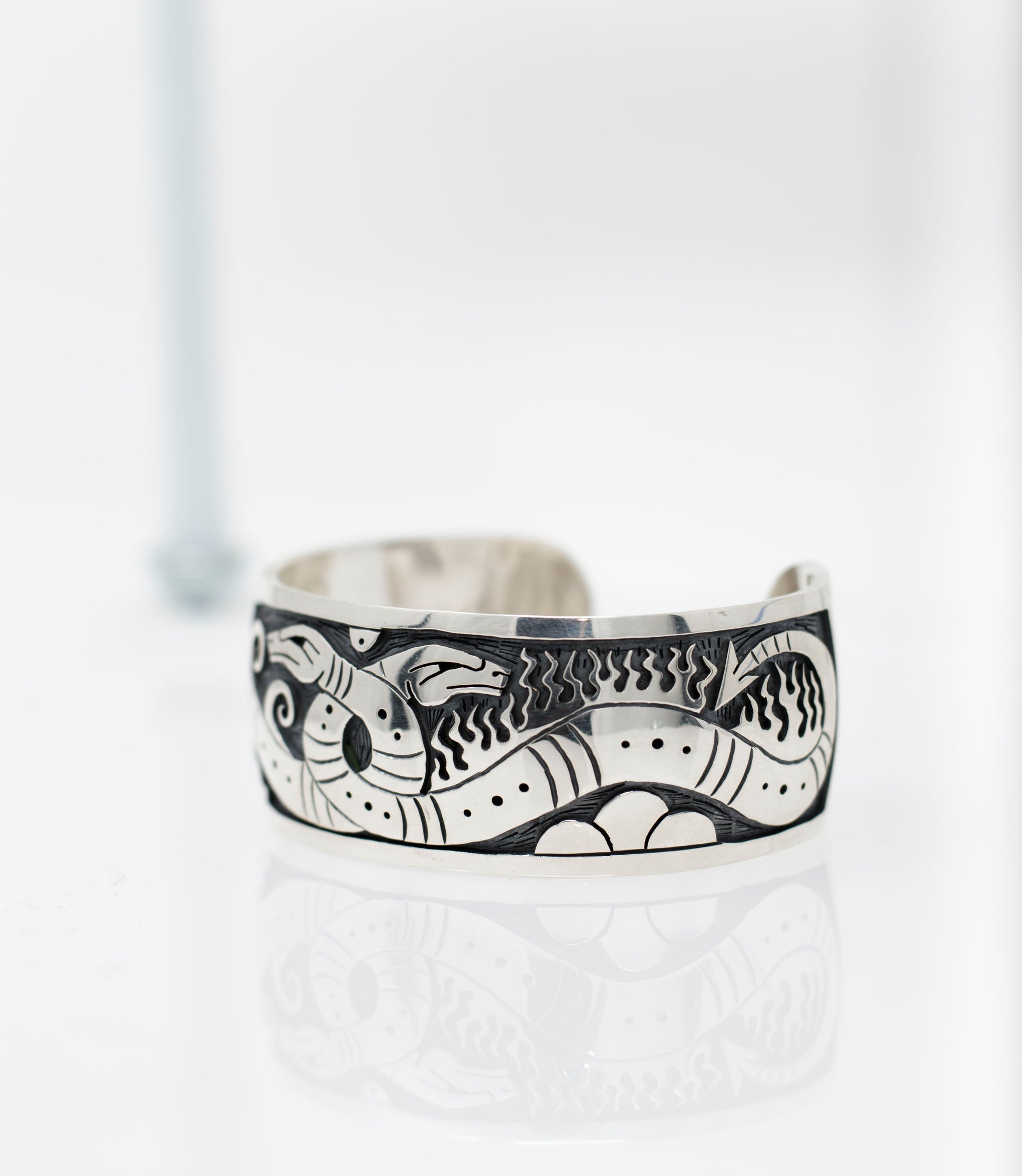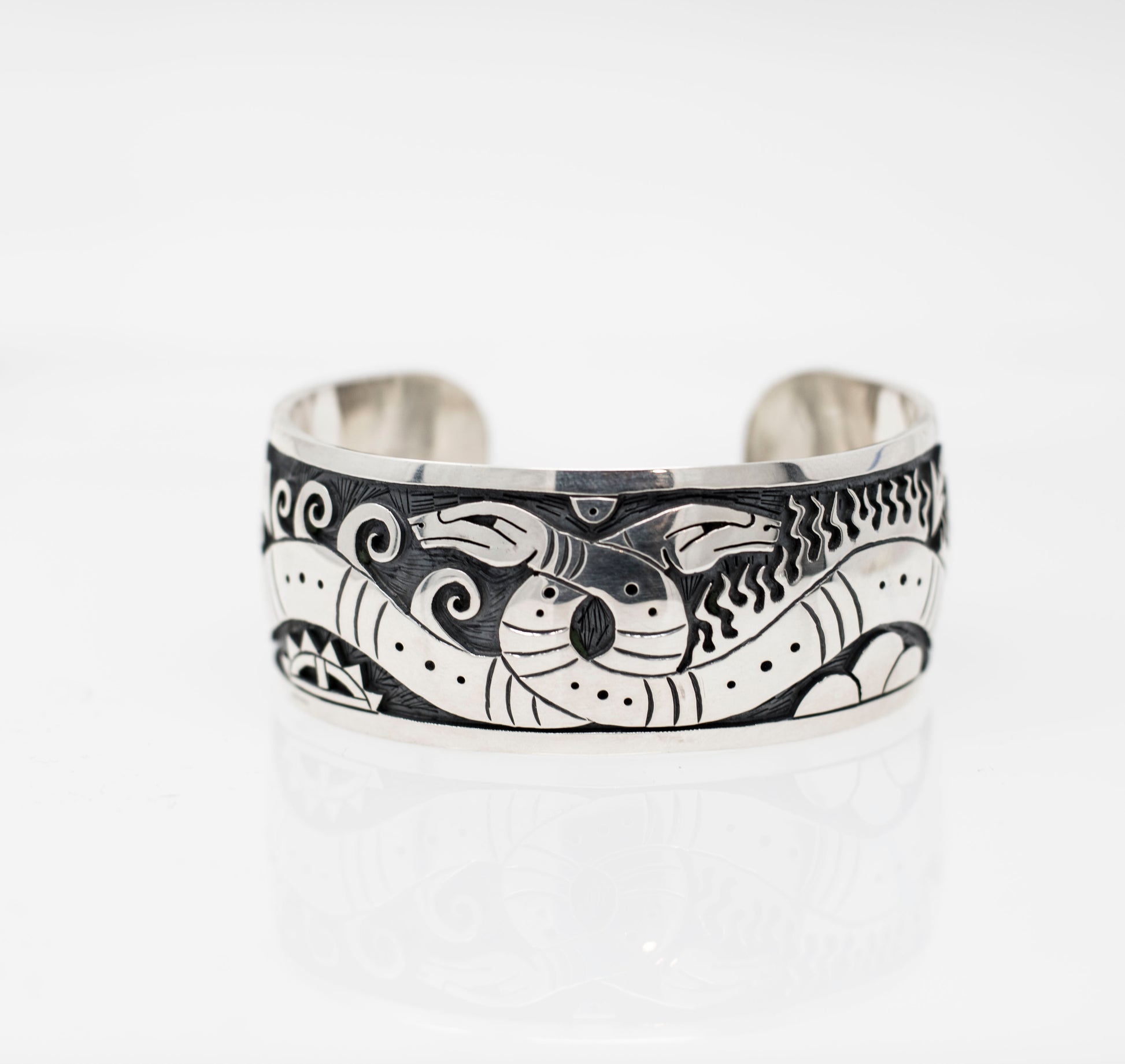 Handcarved sterling silver cuff, depicting fire and water moccasin, and the artist's signature Hopi sun symbol.