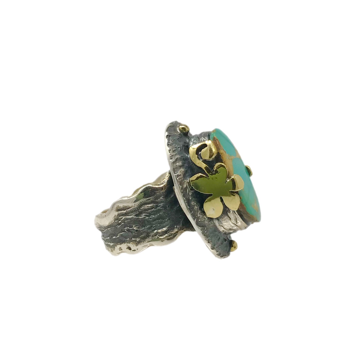 One-of-a-kind: Each piece of BORA jewelry is a unique creation, handmade by Bora & his team in NYC. This Persian turquoise flower ring is a ring with intricate and unique designs in the center of the turquoise stone, surrounded by flowers on the sides. The turquoise stone is an oval-shaped stone, which is located on the top of the ring. The ring is made of 925 sterling silver and 18k gold. This ring is the perfect accessory for any occasion and can be worn in many different ways.