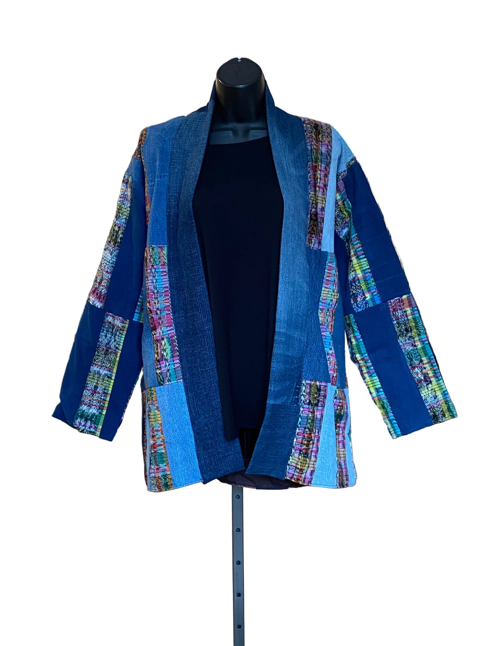 Transform your wardrobe with this one-of-a-kind up-cycle denim jacket, crafted from vibrant recycled ikat fabric sourced directly from Guatemalan artisans. Each jacket tells its own story through bold, hand-woven patterns that celebrate traditional textile heritage while giving new life to materials destined for waste. Perfect for eco-conscious style lovers who refuse to blend in with the crowd. Layer it, rock it solo, or throw it over anything—this jacket is your ticket to looking good and doing good.